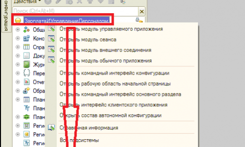 Необходимо зайти в программу в режиме Конфигуратор. Если списка объектов не будет, нужно зайти в меню Конфигурация — Открыть конфигурацию. Далее нажать правой кнопкой мыши на названии конфигурации «Свойства» (показано на скриншоте). Откроется искомое окно с параметрами основной конфигурации. Аналогично можно открыть расширение, зайдя в меню Конфигурация — Расширения — двойной клик мыши (чтобы появился список объектов). Далее правой кнопкой мыши на названии — «Свойства».