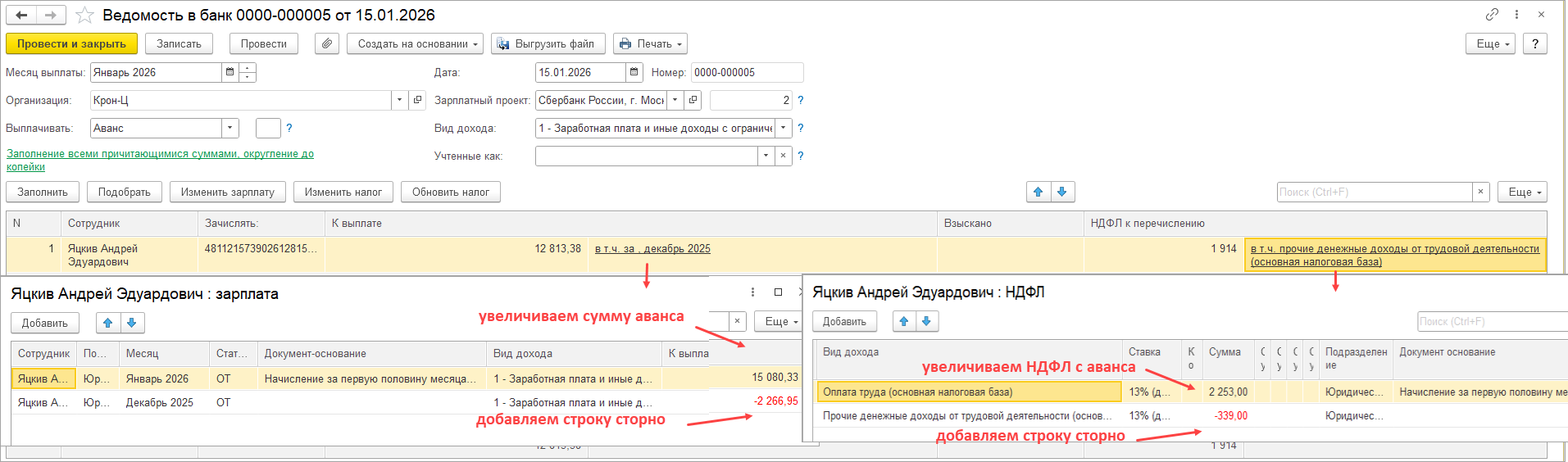Также прикладываю скриншот, как скорректировать ведомость на выплату аванса: