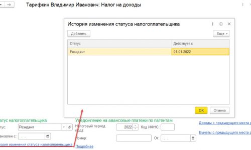 1. Откройте карточку сотрудника и перейдите в раздел «Налог на доходы». Внизу формы есть раздел «Статус налогоплательщика». Нажмите здесь ссылку «История изменения статуса налогоплательщика». Перейдите по ней и с 01.01.2022 укажите статус сотрудника как Резидент.