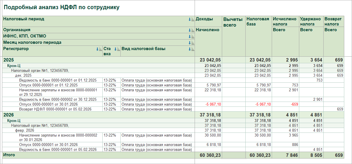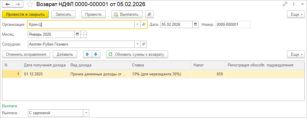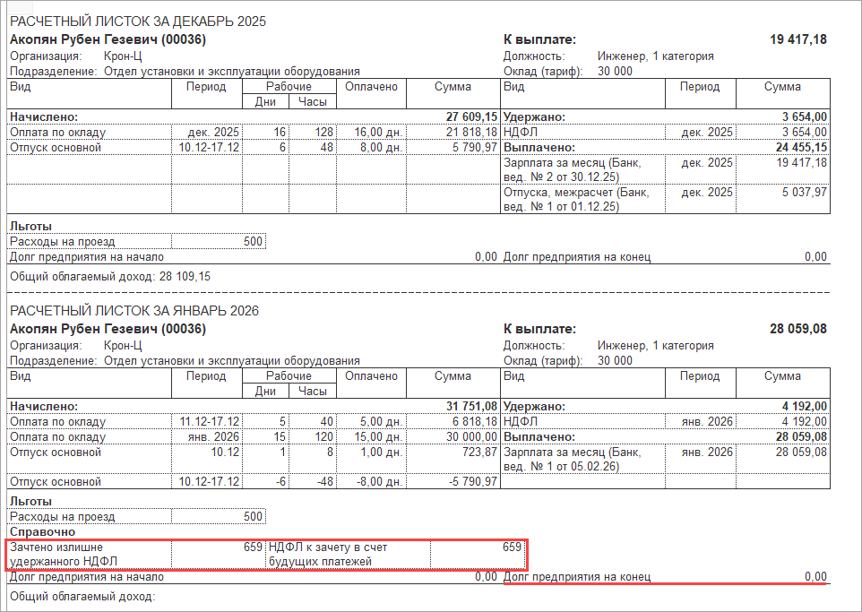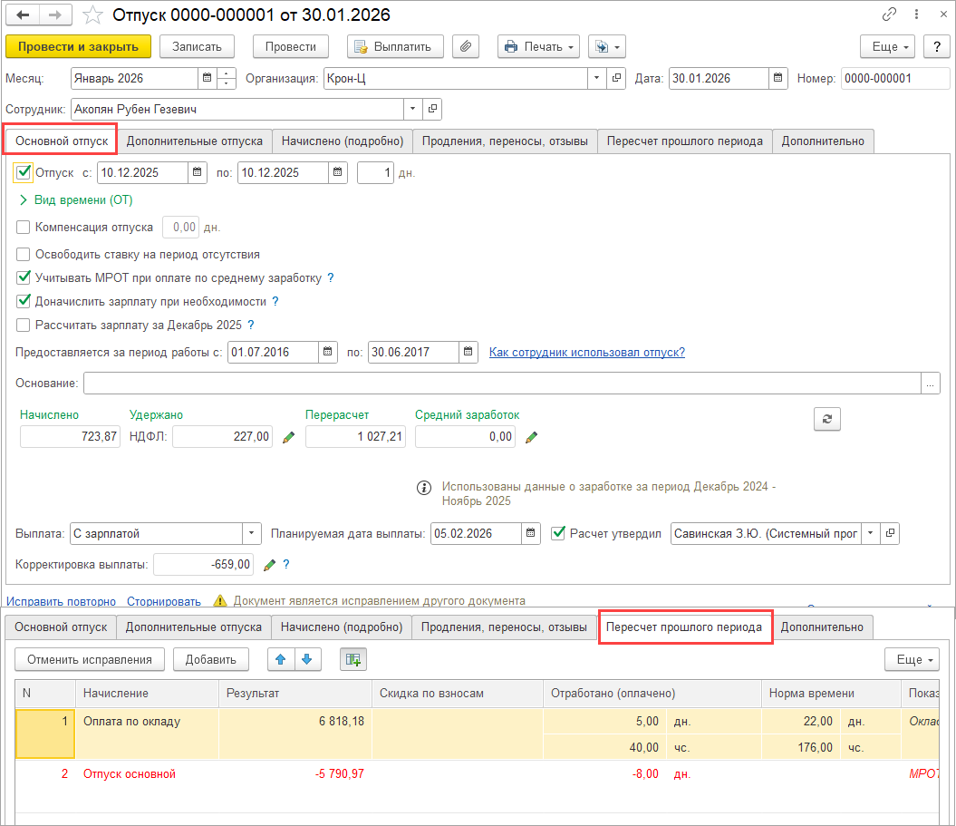 В июле 2025 года был ошибочно рассчитан отпуск сотруднику. Указан период с 04.08.2025 по 17.08.2025 – 14 календарных дней, а правильный период должен быть с 04.08.2025 по 10.08.2025 – 7 календарных дней. Т.о., была переплата по отпускным и недоплата по ЗП. ЗП состоит из оклада и премии, зависящей от количества отработанных дней.
