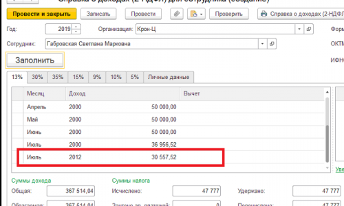 В ходе манипуляций 1С добавляет в регистр сведений «Учет доходов для исчисления НДФЛ» несколько строк (см. вложение — выделено желтым) и в итоге в справке 2-НДФЛ получается сумма с минусом за Август — это разница в отпускных (см. вложение — выделено желтым).
