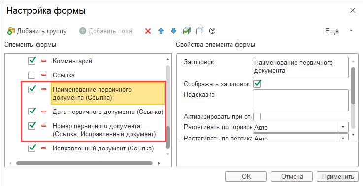 Для первичного документа можно еще вот такие поля вывести: