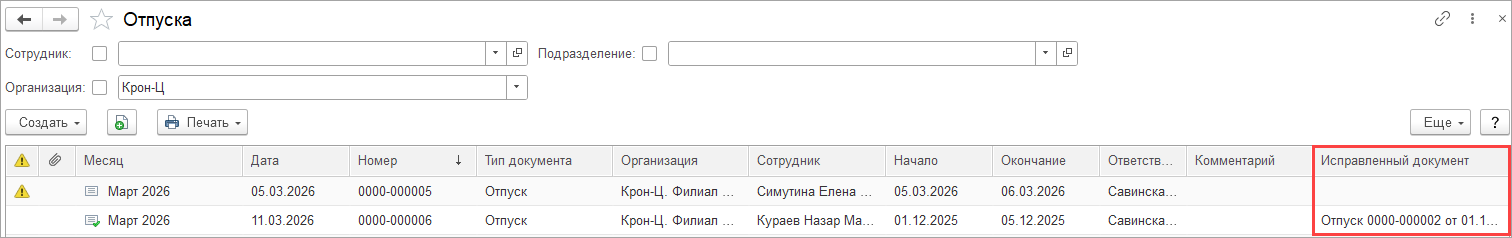 Можно в списке отпусков вывести исправленный документ: