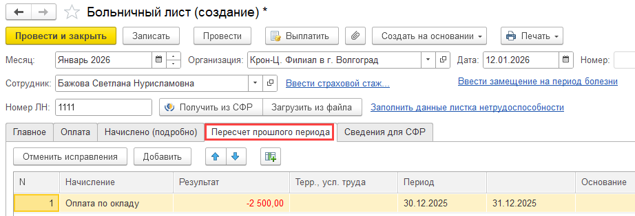 В таком случае перерасчет з/платы за декабрь будет произведен в документе Больничный лист на вкладке «Перерасчет прошлого периода»: