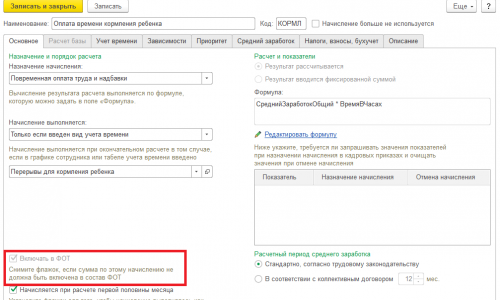 Добрый день. Сотрудница находится на окладе, на пол ставки (для корректного расчета предпраздничных дней, чтобы выплатить ровно пол оклада). Графиком работы ей установлены перерывы для кормления. В начислении «Оплата времени кормления ребенка» галка включать в ФОТ установлена и неактивна. Можно ли сделать так, чтобы оплата времени кормления включалась в ФОТ сотрудника?