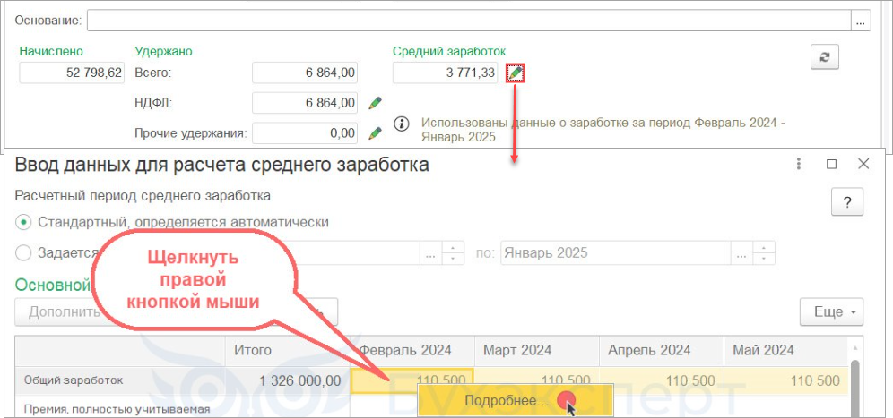 Увидеть суммы заработка по видам начислений помесячно можно в форме ввода данных для расчета среднего, открыть которую можно по зеленому карандашу рядом с суммой среднего.