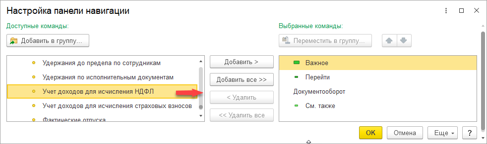 — В открывшемся перетащим регистр Учет доходов для исчисления НДФЛ из левой части окна в правую. Для этого выделим регистр, данные которого хотим посмотреть, и по кнопке Добавить перенесем его в правую часть окна.