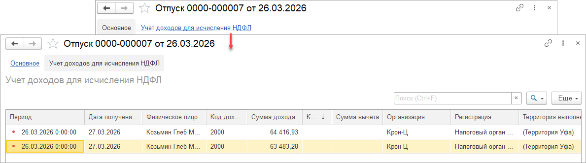 Продолжим дальше искать причину. Предлагаю посмотреть в документе отпуск движения по регистру Учет доходов для исчисления НДФЛ: