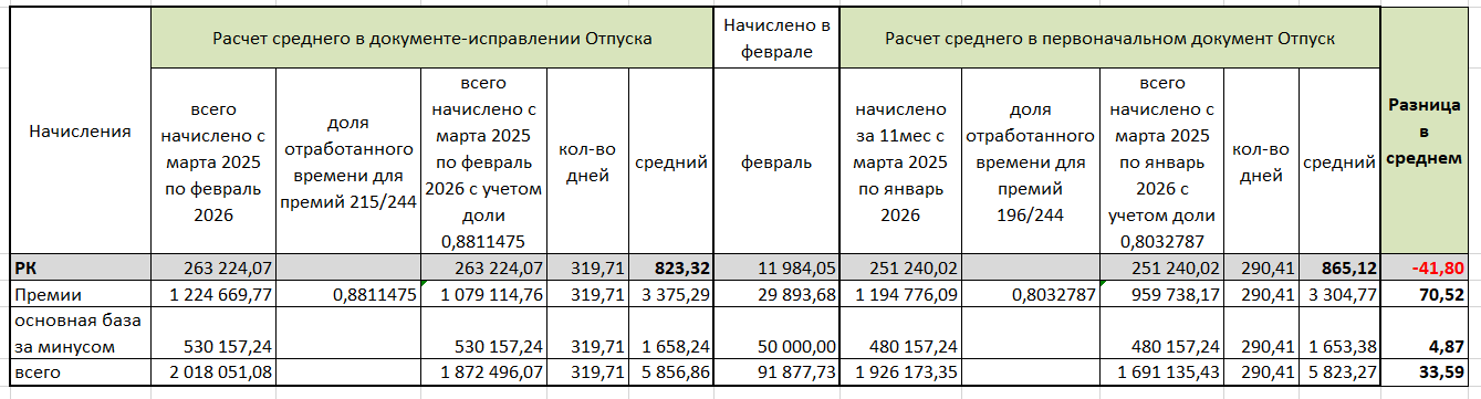 Сделала таблицу с расчетом среднего в первоначальном документе и документе-исправлении Отпуска.