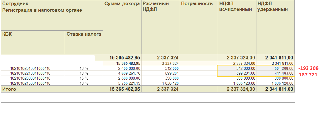 Образовался излишне удержанный налог в сумме 192 208р.
