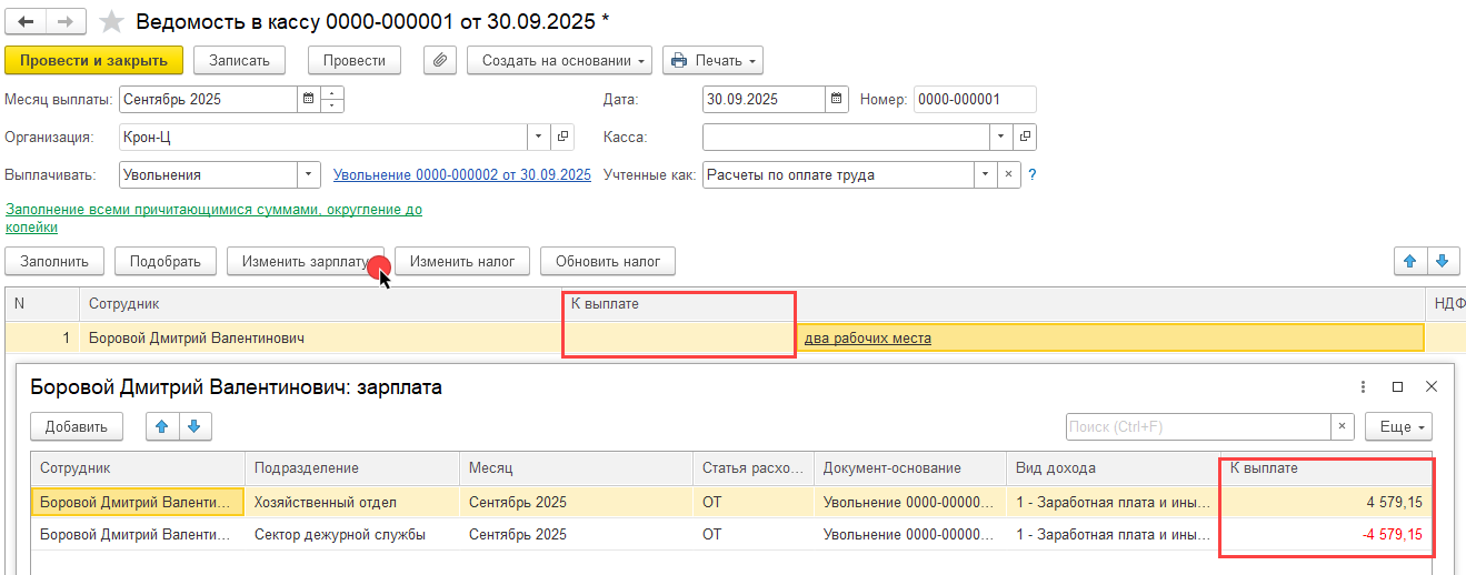 — добавляем сотрудника Влазнева с теми же суммами, что были первоначально. Ожидаем, что в регистре Зарплата к выплате записи обновятся правильно и ошибочных записей сотрудник — физлицо больше не будет.