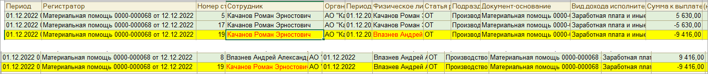 По регистру видим, что Материальная помощь 0000-000068 от 12.12.2022 формирует неправильные движения в разрезе сотрудник — физлицо.