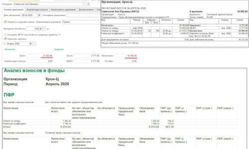 Здравствуйте! Юлия в отпуске, поэтому я отвечу на вопрос. Пришлите, пожалуйста, скриншот отчета «Анализ взносов в фонды» за апрель, чтобы было видно правую часть, закрытую вторым скриншотом, хочу проверить расчет взносов.