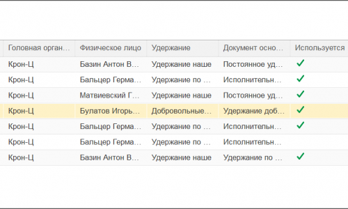 Список плановых удержаний по Сотрудникам — Сотрудник, вид удержания, Дата начала, Дата окончания, Размер.