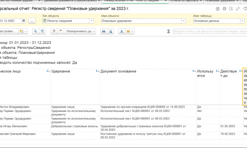 Если сформировать Универсальный отчет по регистру Плановые удержания, мы сможем оттуда взять даты, и размеры удержаний, но там нет % по исполнительным, так как % не пишется в регистры.