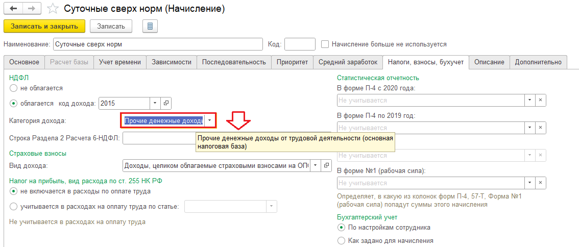 Если считать, что этот доход относится к оплате труда, тогда в настройках начисления необходимо изменить категорию дохода на Прочие денежные доходы от трудовой деятельности (основная налоговая база):