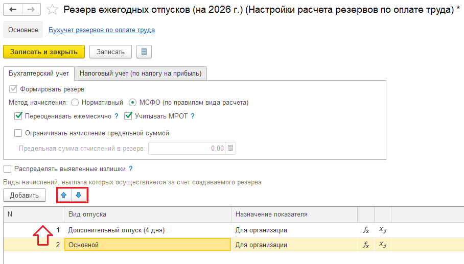 У сотрудника резервов 167 234,55, начисляется ему компенсация основного отпуска на сумму 135 441,95 и компенсация доп. отпуска 33 849,32, общая сумма 169 291,27, т.о. большая часть компенсации за счет резервов и остаток 2 056,72 не за счет резервов. Этот остаток приходится на доп. отпуск, а мы бы хотели, что бы сначала за счет резервов списывались доп. отпуска, а потом уже основной.