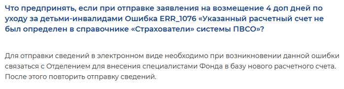 После отправки документа «Заявление в СФР на возмещение выплат родителям детей-инвалидов» от СФР пришло уведомление об ошибке «ERR_1076: (Ф/Л)Указанный расчетный счет и/или лицевой счет не был определен в справочнике «Страхователи» системы ПВСО». Сотрудники СФР сверили реквизиты, сообщили, что в карточке все реквизиты соответствуют реквизитам в заявлении. Помогите, пожалуйста, найти причину ошибки.