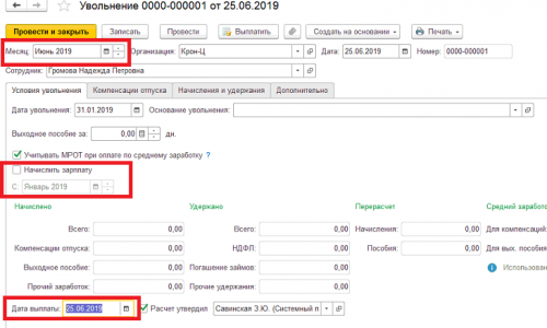 В таком случае нужно ввести документ Увольнение с датой увольнения 30.01.19 и месяцем начисления Июнь 2019. В этом случае данное начисление не затронет закрытый период. В документе Увольнение нужно обратить внимание на даты выплаты дохода по НДФЛ (если он будет) и галочку о начислении зарплаты за Январь 2019.