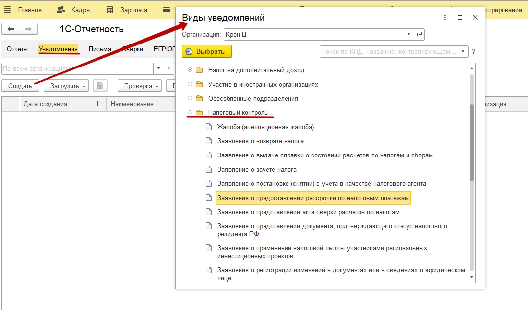 Посмотрите Отчетность и справки — 1С-Отчетность — Уведомления — Создать — Налоговый контроль — Заявление о предоставлении рассрочки по налоговым платежам