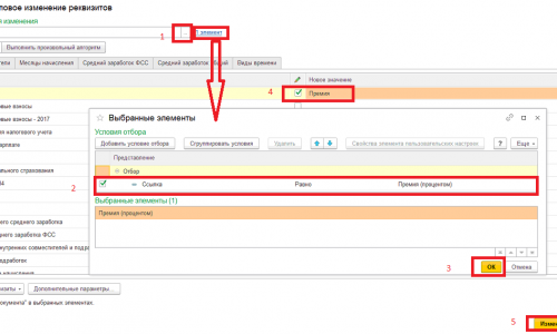 5. Укажите вид назначения «Прочие начисления и выплаты», по отдельному документу — Разовое начисление, сохраните. Далее будем менять документ. Зайдите в раздел Администрирование — обслуживание — Корректировка данных — Групповое изменение реквизитов. Нужно указать Начисления и отобрать одну Премию, указать документ Премия и нажать Изменить реквизиты (см. скриншот). Проверьте, чтобы в отборе было только одно начисление, а то измените у всех! После изменений закладка Средний заработок станет доступна для корректировок.