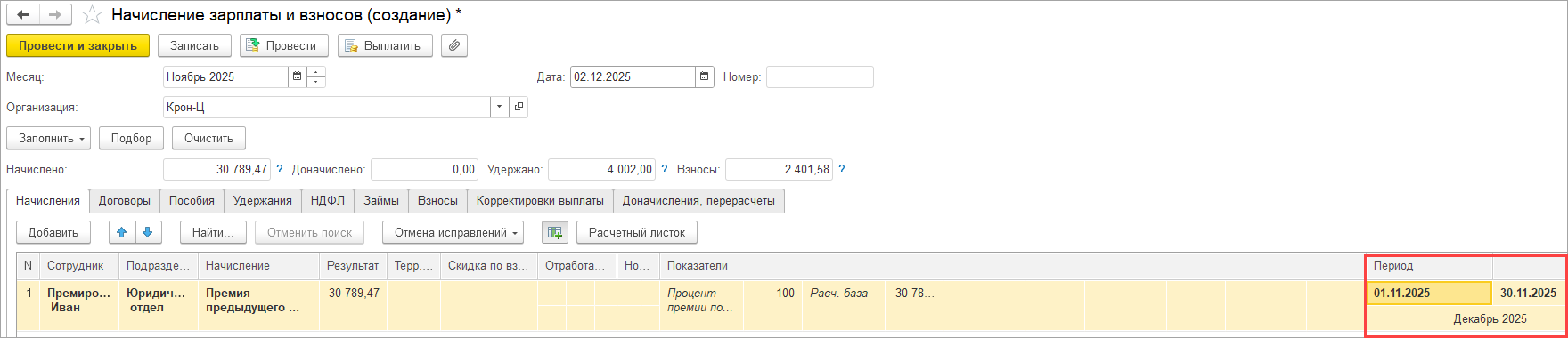 У меня получилось сделать следующим образом. Если в добавить строку с сотрудником и указать правильный период, то программа понимает за какой период нужно взять значение показателей премирования и расчетную базу. После этого показатели и расчетная база подтягиваются автоматически.