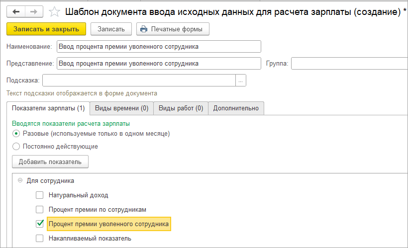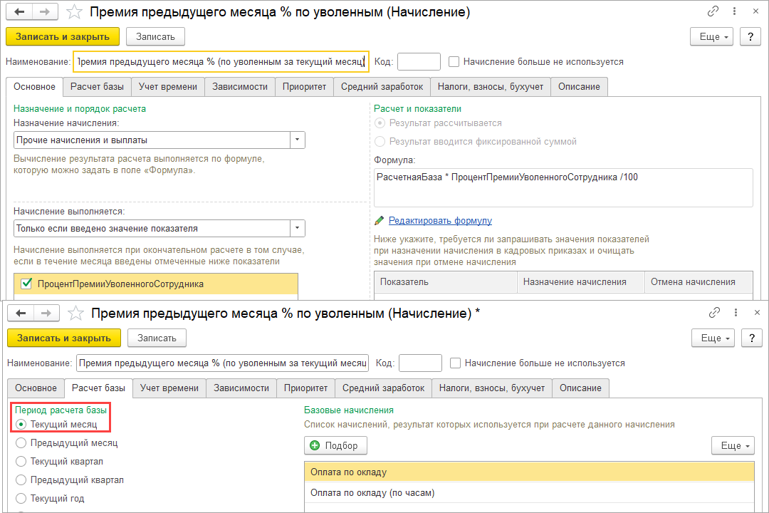Для этого настроим выстреливающее начисление, которое будет рассчитываться, если введено значение показателя «ПроцентПремииУволенногоСотрудника» и укажем расчет от расчетной базы текущего месяца: