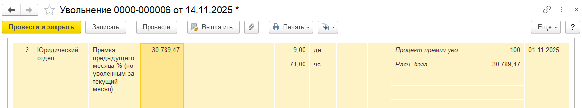 После ввода размера премии в документе Увольнение рассчитывается премия за текущий месяц: