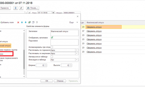 2. Добрый день! Попробуйте в документе График отпусков установить курсор на поле Фактический отпуск (на любую ячейку этого поля) и нажмите меню справа сверху Ещё — Изменить форму, если галочка у поля Перенос не установлена, установите. Если такого поля нет, то в этой же форме нажмите Ещё — Установить стандартные настройки.