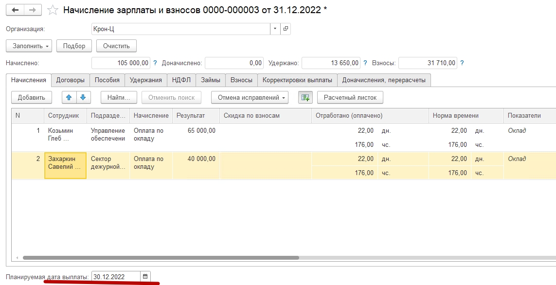 В документе Начисление зарплаты указать планируемую дату выплаты — 30.12.2022 г, тогда доход попадает в 2022г. Но это при условии, что зарплата за декабрь 2022 г. должна быть выплачена в декабре 2022 года. Если же зарплата за декабрь выплачена в январе 2023 г, то по новым правилам это уже доход 2023 г. Подробнее Вы можете ознакомиться с информацией в статье ЗАРПЛАТА ЗА ДЕКАБРЬ 2022 ГОДА: КОГДА ВЫПЛАЧИВАТЬ И КАК ОТРАЗИТЬ В 6-НДФЛ
