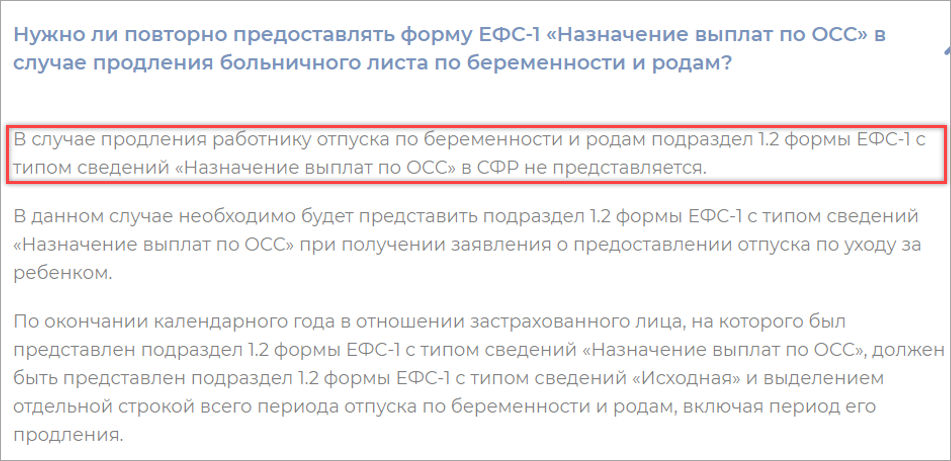 1. На сайте СФР есть информация о том, что в случае продления работнику больничного по беременности и родам подраздел 1.2 формы ЕФС-1 с типом сведений «Назначение выплат по ОСС» в СФР не представляется: https://sfr.gov.ru/employers/general_information/reporting/faq_sub_2