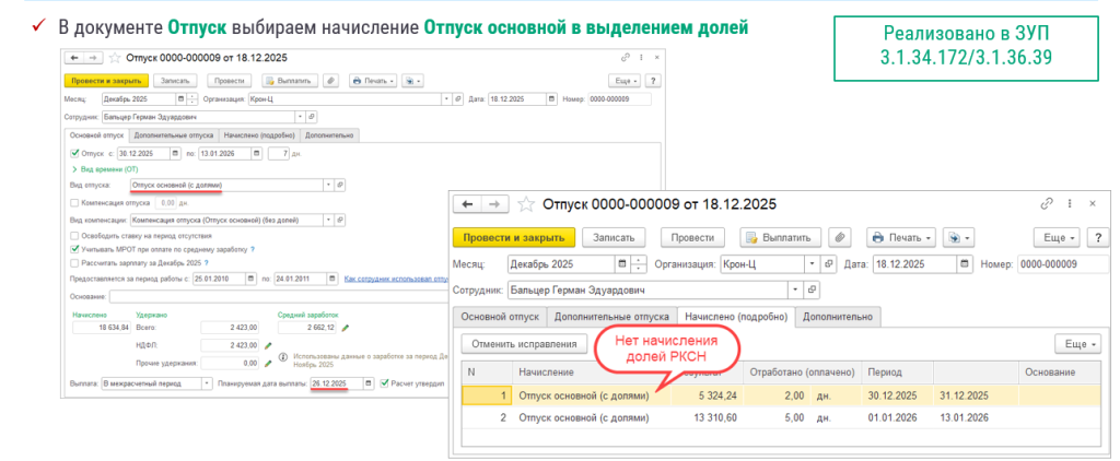 На вашем релизе реализовано поведение программы, разбивка начислений на «основное» + «долевые» зависит от планируемой даты выплаты в документе Отпуск. Поэтому сейчас лучше выбрать начисление новое, в выделением долей. Но так как дата выплаты в декабре 2025, доли выделять не будут.
