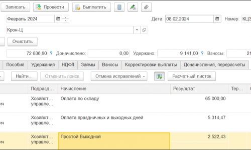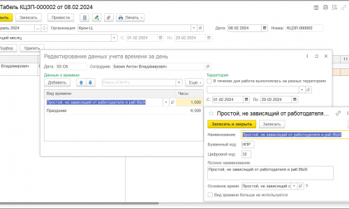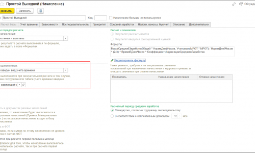 Фиксируем его в Табеле. Настраиваем новое начисление, в котором указываем, что будем считать когда введено время. Считаем все в начисление зарплаты.