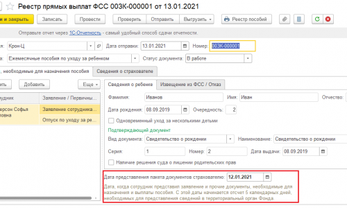 Здравствуйте! Номер самого заявления в ФСС не отправляется. Они скорее всего имеют в виду дату предоставления пакета документов страхователю (она показана на скриншоте) . Т.к срок направления реестра в ФСС – не позднее 5 дней с момента получения заявления и подтверждающих документов от сотрудницы (п. 3 положения, утв. постановлением Правительства РФ от 21.04.2011 № 294). Можно указать текущую дату.