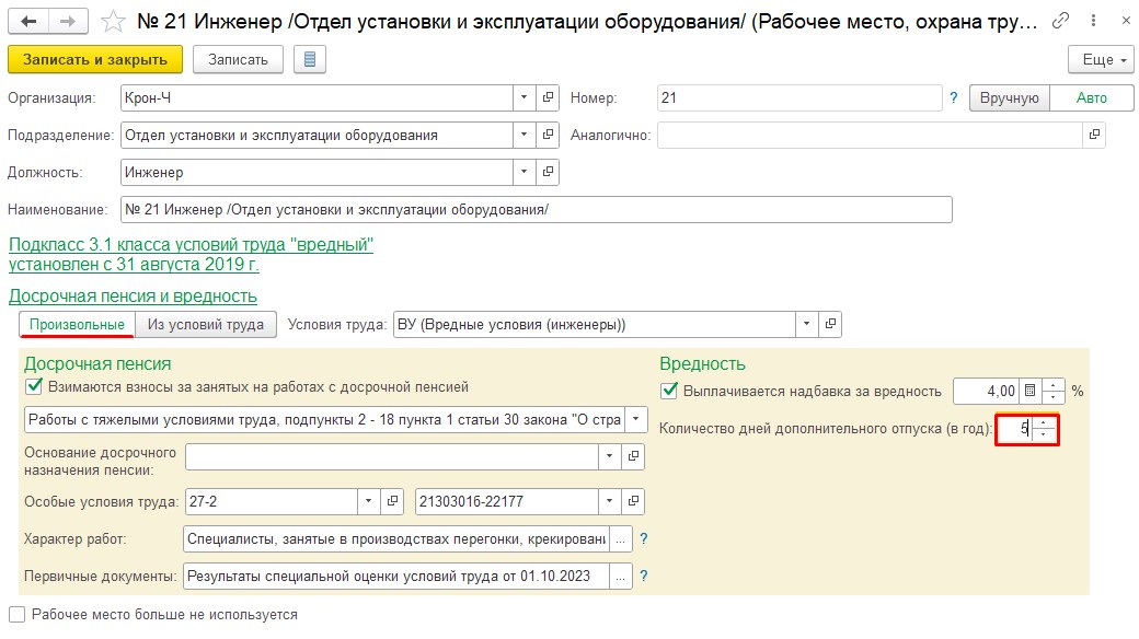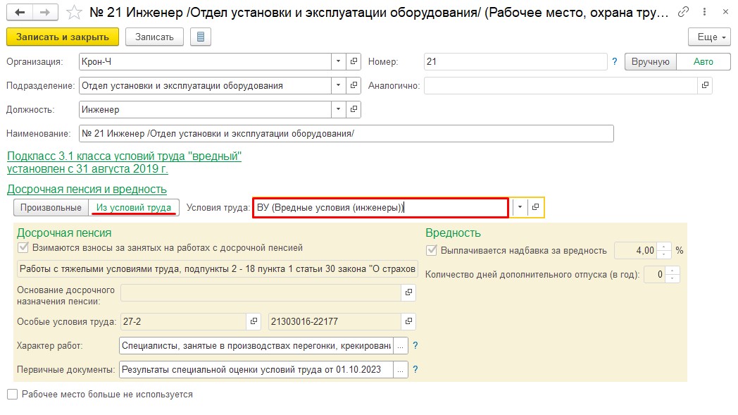 Ведется учет по рабочим местам охраны труда. Применяются условия труда рабочих мест для расчета зарплаты. Используется специальная оценка условий труда.