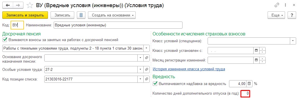 К сожалению, в рабочем месте хранится история только для класса условий труда. Для отпуска и надбавки за вредность истории изменения нет. Можно добавить доп. реквизит(Администрирование-Общие настройки-Свойства-Дополнительные реквизиты). Добавляем реквизит с типом значения строка, в результате в рабочем месте у нас будет доступно поле,где мы сможем указать первичные документы.