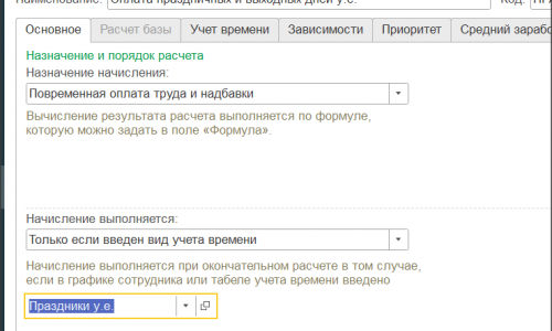 Необходимо сделать такое же начисление для расчета Праздничных, чтобы разделить начисления для обычных сотрудников и иностранцев, можно выделить отдельно вид рабочего времени праздники, и использовать его, тогда автоматом будет считаться начисление «Оплата праздничных в у.е»
