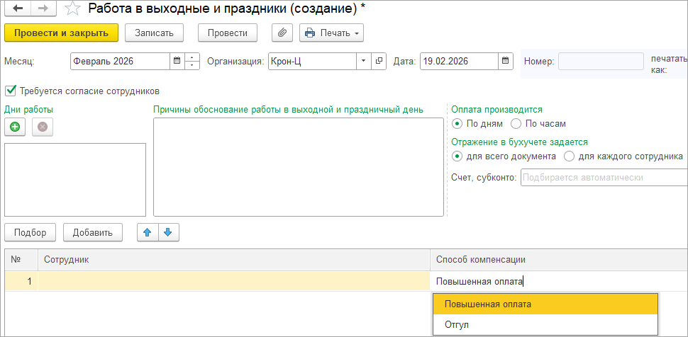 В этом случае мы, как правило в ЗУП вводим документ Работа в выходные и праздники, в котором выбираем способ компенсации Отгул или Повышенная оплата: