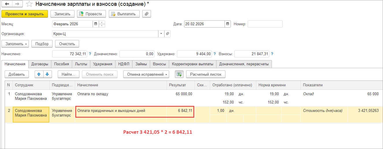 В результате в документе Начисление зарплаты и взносов рассчитывается оплата праздничных.
