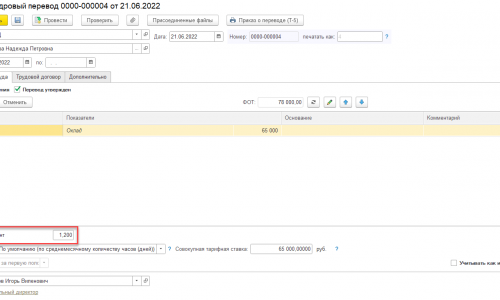 Теперь в самом Подразделение (Кадры) укажем размер коэффициента 1.2.