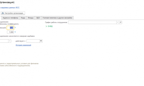 Если же подразделение не выделено на отдельный баланс, то в карточке организации на Вкладке «Основные сведения» поставим флажок, что есть районный коэффициент. Параметр оставим 1.