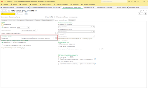 10. Ранее прикладываю настройки начисления Натуральный доход. Там указано, что полностью облагается страховыми взносами. Значит такое начисление должно попадать в расчет пособия по ЭЛН.