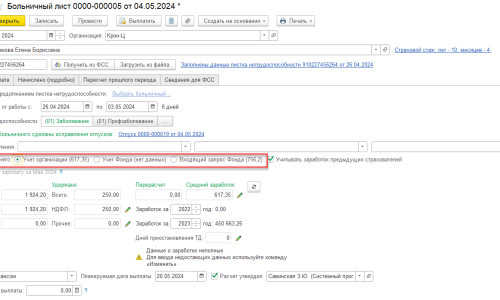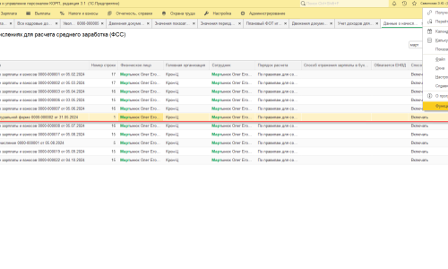 Сам документ можно не открывать, просто из самого журнала — выделить и перепровести документ. После этого можно сразу проверить регистр Данные о начислениях для расчета среднего заработка (ФСС) — появились ли записи о сумме дохода.