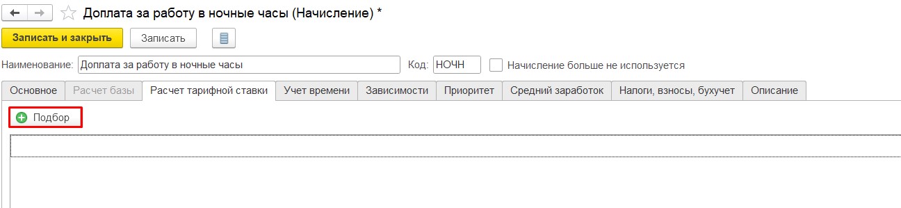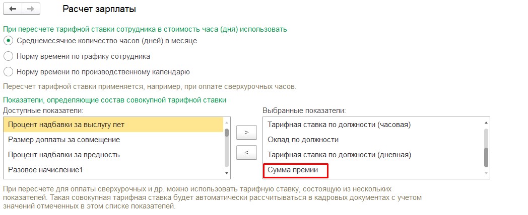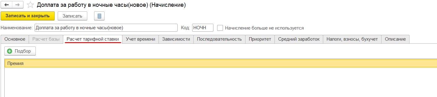 Возможно, премия у Вас настроена, как разовая или «выстреливающая», тогда в настройках расчета зарплаты ее не будет в доступных показателях. В этом случае для включения премии в расчете ночных в формуле ночных используем показатель Стоимость дня (часа) с учетом разовых начислений. Когда мы его применяем в формуле, в начислении появляется вкладка Расчет тарифной ставки, где можно выбрать премию,которую будем включать в расчет. Подробнее про этот механизм рассказано здесь Расчет сверхурочных с учетом премий и надбавок (ЗУП 3.1.30.81 / 3.1.31.32).