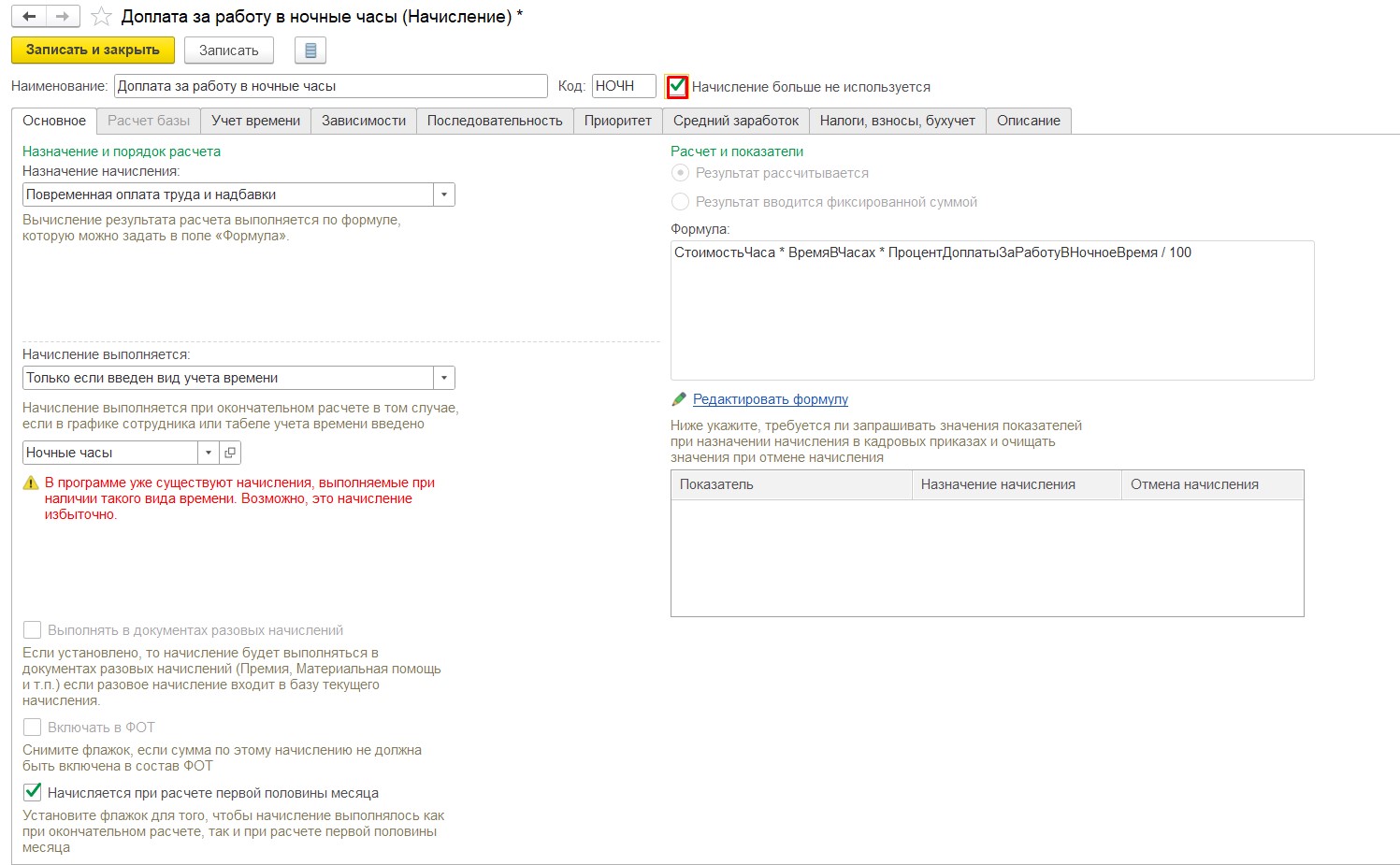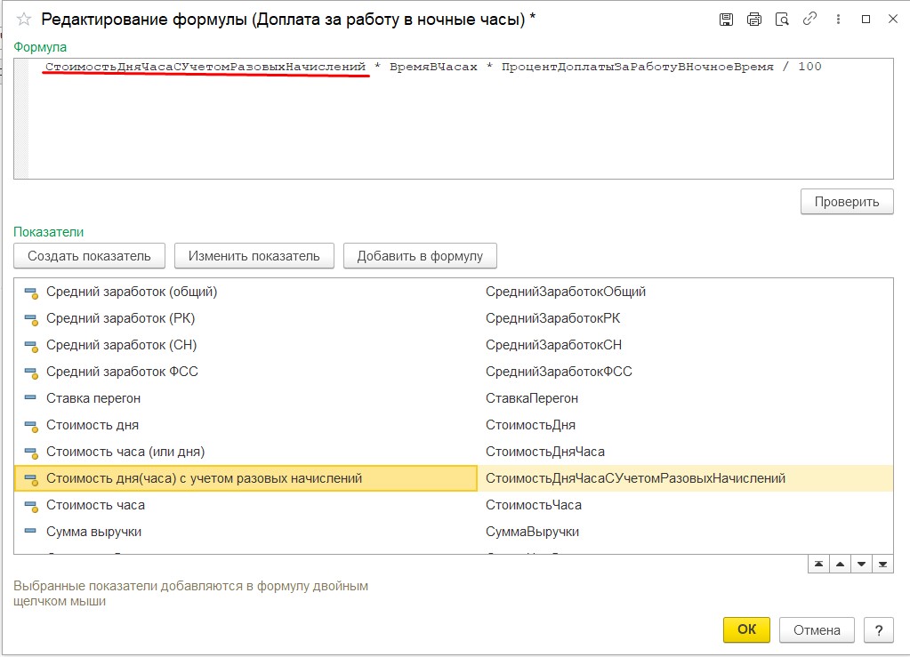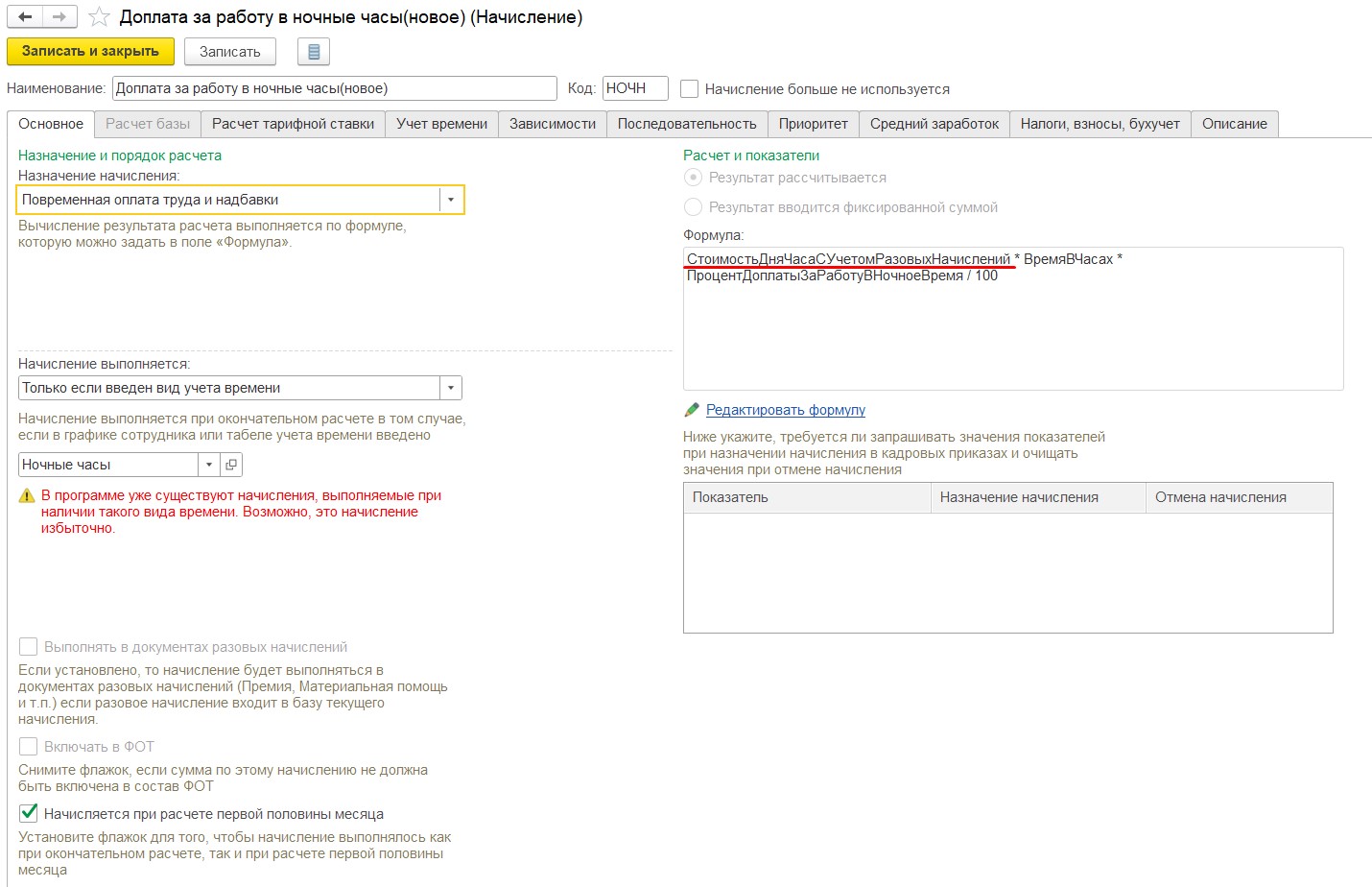 2)Создадим новое начисление для оплаты ночных, в формулу добавляем показатель СтоимостьДняЧасаСУчетомРазовыхНачислений