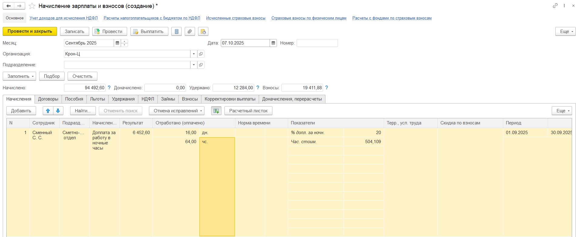 Позиция 2. В расчет доплаты за ночные включаем только основную оплату (оклад, ЧТС)