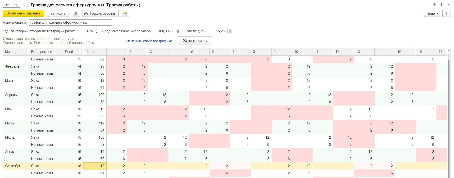 Согласна с Вашим расчетом, будем искать в чем может быть причина. Приложите пожалуйста скриншот настроек доплаты за ночные часы и скриншот настроек графика, которые появляются по ссылке Изменить свойства графика(пример прилагаю),попробую смоделировать ситуацию у себя в базе