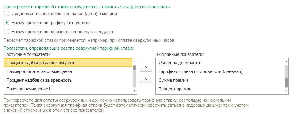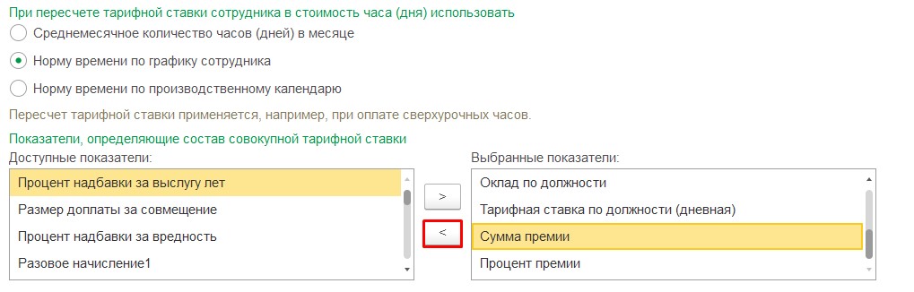 1)Удаляем премию из выбранных показателей в настройках расчета зарплаты. Важно: удаление премии из этой вкладки влияет на расчет сверхурочных и праздничных. Чтобы она и дальше попадала в их расчет, нужно будет создать новые начисления, также как для ночных с применением показателя Стоимость часа дня с учетом разовых начислений (см. п 2)Подробнее о переходе на новые начисления можно почитать в статье по ссылке Переход на расчет сверхурочных и работы в выходной с учетом премий и надбавок.