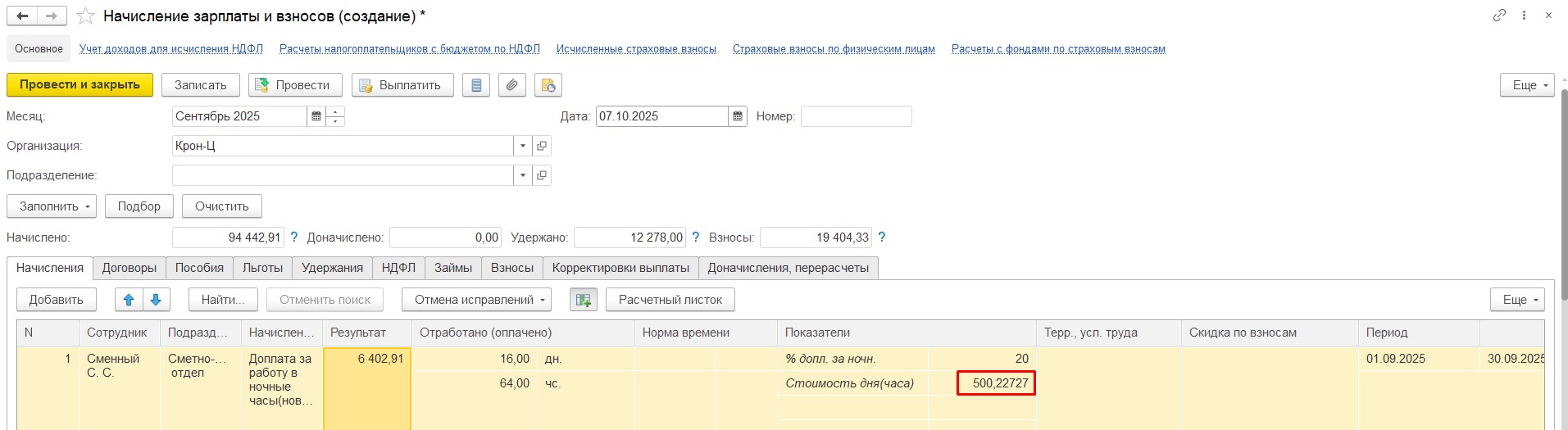 Чтобы добиться расчета с результатом 500,23, можно попробовать такой вариант. Сразу скажу, он довольно трудоемкий и потребует перехода на расчет с применением показателя Стоимость дня часа с учетом разовых начислений. Все действия сначала пробуем делать на копии базы: