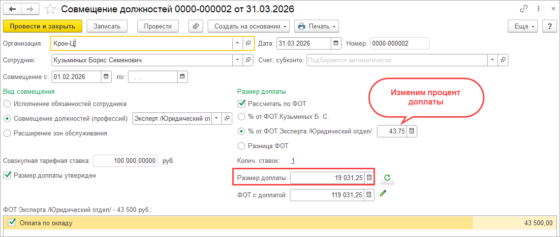 2. Здравствуйте. В нашем случае сотрудник-инвалид совмещает вакантную ставку в размере 50 % от ФОТ совмещаемой должности. Совмещение введено на весь месяц. Размер доплаты в документе «Совмещение» 21 750,00 руб. за полностью отработанный месяц. Это 50% от ФОТ позиции штатного расписания. Сотрудник полностью отработал месяц. Ожидаемая сумма доплаты за совмещение 21750/152 (норма времени в феврале 2026)*133 (отработал фактически сотрудник-инвалид, рабочий день сокращен на 1 час)= 19 031,25 руб. Предложенные варианты не подходят.
